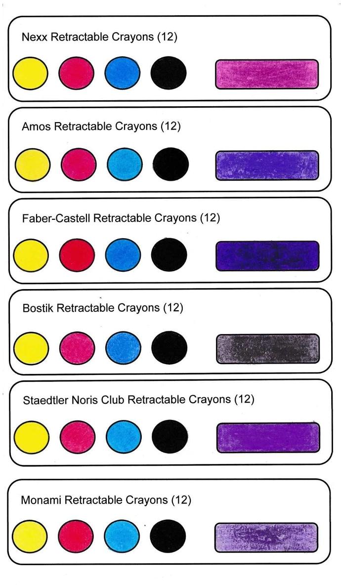 The crayons are easy to use, and the barrels are easy to grip and feel sturdy. I was able to pull some of the crayons from the barrel, and some of the crayons were not as easy to twist. Overall, the Bostik Retractable Crayons are easy to use, but the brand could be improved. The scanned swatch card unfortunately made the purple of this set seem much darker than it is in reality.